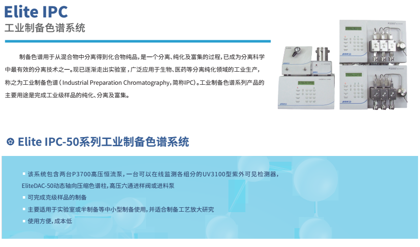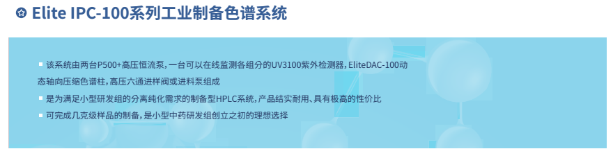 依利特科技的高壓半制備液相色譜系統(tǒng) EClassical3500/3700,巧妙融合了分析與半制備功能,為您打造一套完整的自動 HPLC 應用方案,輕松應對化合物的分析與制備需求。這套系統(tǒng)能讓分析與半制備之間的切換變得簡單自如,樣品進樣、餾分收集等工作也能有條不紊地完成。而依利特工業(yè)制備 Elite IPC 色譜系統(tǒng),從幾克級到十克級的樣品制備都能輕松勝任,無論是小型藥物研發(fā)團隊還是大型純化實驗室,都能在這里找到合適的選擇。?