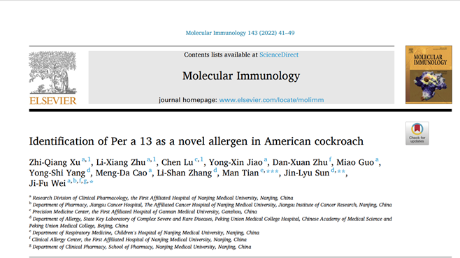 《Molecular Immunology》是國際免疫學(xué)領(lǐng)域權(quán)威期刊之一,由世界著名的學(xué)術(shù)出版商Elsevier公司出版發(fā)行,是美國SCI 數(shù)據(jù)庫收錄的核心期刊,2021年影響因子為4.4?!禡olecular Immunology》致力于免疫學(xué)研究領(lǐng)域的各個方向,尤其注重在細(xì)胞水平、生物化學(xué)水平及遺傳學(xué)水平,深入揭示各種免疫學(xué)現(xiàn)象的機(jī)制。在《Molecular Immunology》143(2022)41-49發(fā)表的《Identification of Per a 13 as a novel allergen inAmerican cockroach》一文中,首次在美洲大蠊(蟑螂的一種)中鑒定到一個屬于甘油醛3-磷酸脫氫酶(GAPDH)類型的過敏原,被國際組織認(rèn)定為Per a 13。