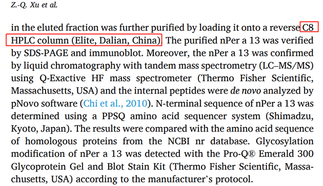 蟑螂是一類重要的室內(nèi)致敏物質(zhì)來源,暴露于蟑螂過敏原與免疫球蛋白E介導(dǎo)的過敏性疾病密切相關(guān)。Per a 13為動物源性吸入性過敏原的一個全新類型,有助于用于蟑螂過敏診斷和治療。上面論文中Per a 13的純化,使用的是依利特的SinoChrom C8 10μm,10.0 mm×250 mm色譜柱,純化效果好,得到的樣品純度高。
