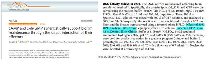 英國(guó)大綜合類期刊Nature Communications,創(chuàng)刊于2010年,是首個(gè)冠名“Nature”品牌的純開(kāi)放獲取刊物,由英國(guó)Nature Publishing Group出版社出版發(fā)行。Nature Communications致力于發(fā)表生物、醫(yī)學(xué)、健康、物理、化學(xué)和地球科學(xué)等各領(lǐng)域的高質(zhì)量研究。據(jù)統(tǒng)計(jì)2022年該雜志的影響因子為14.91。該期刊在13期1493(2022)發(fā)表一篇《cAMP and c-di-GMP synergistically support biofilm maintenance through the direct interaction of their effectors》文章。該文章提供了在細(xì)菌中cAMP和c-di-GMP通路之間通過(guò)效應(yīng)物直接相互作用的證據(jù),并表明cAMP-CRP可以在翻譯后發(fā)揮調(diào)節(jié)作用。其中DGC體外活性測(cè)定中核苷酸檢測(cè)分析使用的就是依利特的EClassical系列液相色譜儀以及依利特Supersil系列色譜柱。