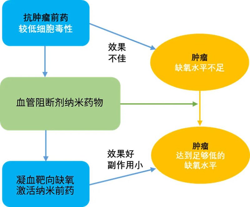 缺氧是實(shí)體腫瘤的共同特征,被認(rèn)為是腫瘤治療的佳靶點(diǎn)之一。但是實(shí)體腫瘤細(xì)胞中的缺氧水平往往達(dá)不到選擇性激活腫瘤治療藥物的需求。如果在遞送腫瘤治療藥物的同時(shí),能夠遞送加劇腫瘤區(qū)域缺氧的藥物,就能更有效地靶向治療,精準(zhǔn)地在目標(biāo)腫瘤區(qū)域差異化地激活治療藥物,讓腫瘤藥物療效顯著增長(zhǎng),同時(shí)還能有效降低藥物在體內(nèi)代謝循環(huán)過(guò)程中的毒副作用和風(fēng)險(xiǎn)。