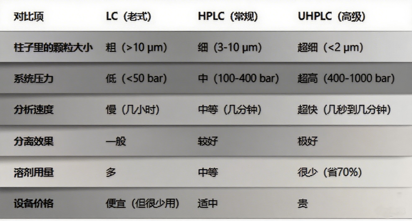 UHPLC:適合高端研究或是超快速分析,比如新藥研發(fā)、代謝組學(xué)研究等。