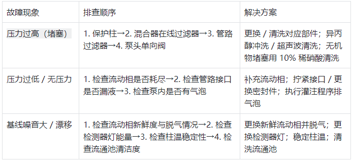 平時(shí)多注意預(yù)防,能少出很多故障。要是遇到壓力過高(大概率是堵塞了),可以按照這個(gè)順序檢查和清洗:先檢查保護(hù)柱,該換就換、該洗就洗;然后是混合器里的在線過濾器,拆下來清洗干凈;接著是管路過濾器,同樣檢查清洗;后是泵頭單向閥,要是堵了,用異丙醇沖洗,或者放超聲波里用異丙醇清洗,要是無機(jī)物堵塞,還能用 10% 的稀硝酸清洗。?