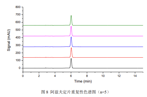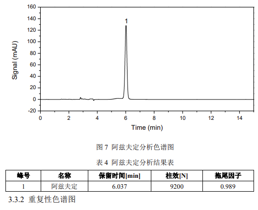 樣品溶液配制:取供試品 1 藥品 1 粒,稱量質(zhì)量為 0.1477g,取部分后研磨,稱取質(zhì)量為 0.0287g,用 2mL 甲醇溶解,離心,取上層清液,濾過(guò);量取 0.5mL 上述溶液,量取乙腈 / 水 = 10:90 的溶液 0.5mL 將其稀釋,得含供試品 1 濃度為 7.175mg/mL 的供試品溶液 1。按每粒藥品含阿茲夫定 1mg 計(jì)算,供試品溶液 1 中的阿茲夫定含量為 0.049mg/mL。
