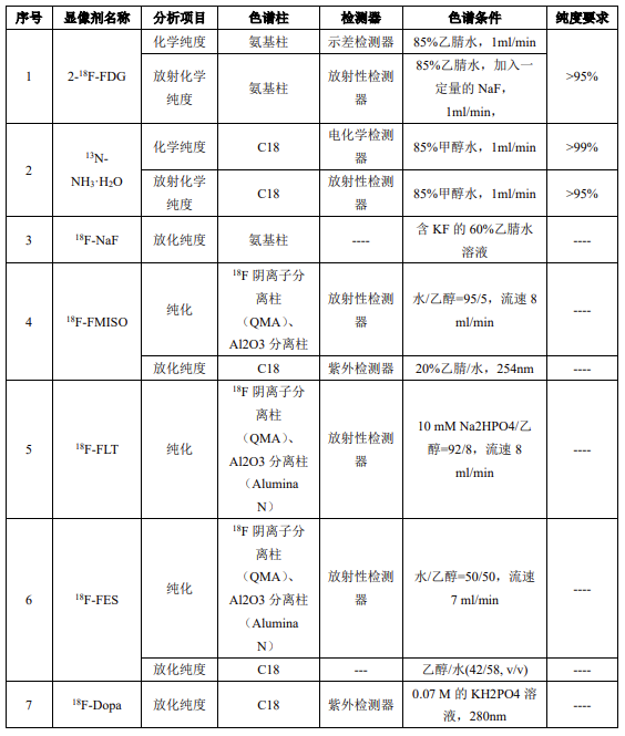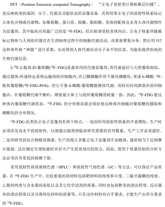 \(^{18}\text{F}\)是載于美國藥典的第一個 PET 放射性藥物,需要對放射性核純度、化學純度、放射化學純度、比活度等質(zhì)量指標進行控制,同時需要對合成反應的副產(chǎn)物含量進行控制,而液相色譜法是進行\(zhòng)(^{18}\text{F}\)-FDG 化學純度分析的好方法。