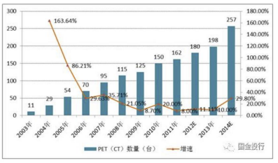 正是 PET-CT 在部分領(lǐng)域的獨特效用,國內(nèi)裝機數(shù)量不斷增長。根據(jù)相關(guān)普查情況,自本世紀初西安萬杰長信醫(yī)院(現(xiàn)已更名 “長安醫(yī)院”)購買了中國大陸第一臺 PET-CT 設(shè)備,中國 PET-CT 的數(shù)量已經(jīng)增長到 2014 年的 257 臺,年均復合增長率超過 30%。