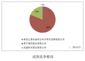 對我們來講,配套試劑 FDG 注射液的制備純化和純度分析需要用到液相色譜,而 FDG 注射液目前主要是國內(nèi)公司占據(jù)主要市場份額,PDB 數(shù)據(jù)庫顯示南京江原、原子高科、安盛科興基本占據(jù)全部市場。其中原子高科的市場占有率高,達到近 80%,主要歸功于其市場布局較為完善,價格低于安盛科興。