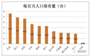 從保有量看,丹麥每百萬人口 PET-CT 保有量高,達到 5.61 臺 / 每百萬人,相比之下中國只有 0.18 臺 / 每百萬人,排名靠前的 10 個國家中,少的芬蘭也有 1.86 臺 / 每百萬人,設(shè)備數(shù)量方面有 10 倍多的提升空間。