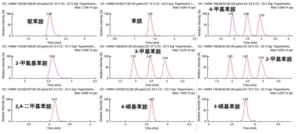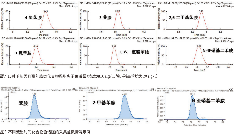 本方法采用一針進(jìn)樣同時(shí)測(cè)定 13 種苯胺類(lèi)和 2 種聯(lián)苯胺類(lèi)化合物,圖 1 和圖 2 中分別展示了 15 種化合物的 MRM 疊加譜圖和提取離子色譜圖??梢?jiàn)各個(gè)化合物的峰型對(duì)稱(chēng),所有異構(gòu)體均取得良好的分離,并保證每個(gè)色譜峰上有足夠的采集點(diǎn)數(shù),以便獲得準(zhǔn)確的結(jié)果及優(yōu)異的重復(fù)性。