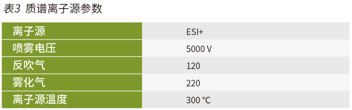 采用 Elite MSVertical 9100 三重四極桿液質(zhì)聯(lián)用系統(tǒng)進(jìn)行分析,離子源參數(shù)及目標(biāo)化合物質(zhì)譜參數(shù)見(jiàn)表 2 和表 3。