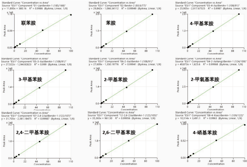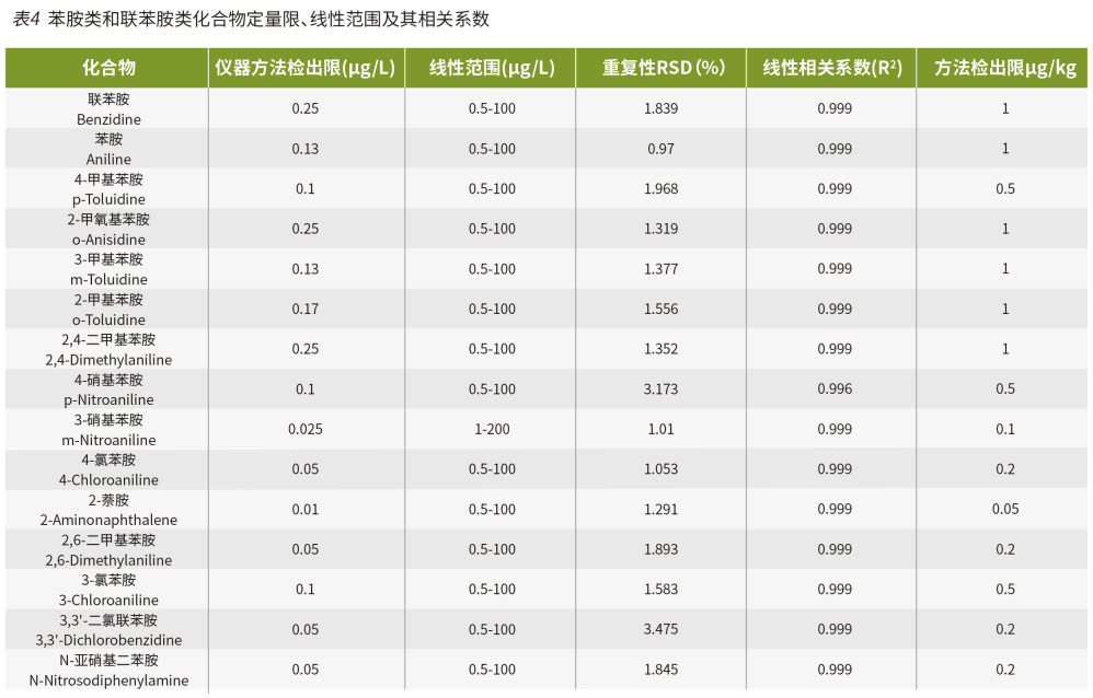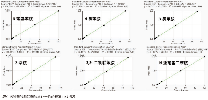 用含 25% 的甲醇水溶液稀釋 15 種苯胺類(lèi)和聯(lián)苯胺類(lèi)化合物的混合標(biāo)準(zhǔn)溶液,制成 0.5μg/L-100μg/L 的系列校準(zhǔn)標(biāo)準(zhǔn)溶液,其中除 3 - 硝基苯胺為 1μg/L-200μg/L,并繪制標(biāo)準(zhǔn)曲線。圖 4 為 15 種化合物的標(biāo)準(zhǔn)曲線情況。其中各個(gè)化合物在線性范圍內(nèi),線性關(guān)系均較好,相關(guān)系數(shù) R 均大于 0.995。同時(shí)考察了儀器方法的檢出限及定量限濃度的 6 針重現(xiàn)性測(cè)試(見(jiàn)表 4),實(shí)驗(yàn)結(jié)果表明,該儀器方法對(duì)于測(cè)定 15 種化合物具有優(yōu)異的線性及重現(xiàn)性,以及較高的靈敏度。