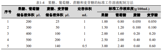標準曲線的制備:準確稱 2.5g 果糖、2.0g 葡萄糖標準品(精確至 0.0001g),加適量 40% 乙腈溶液溶解,并定容至 50mL,過濾,作為儲備液;準確稱 1.0g 蔗糖、1.0g 麥芽糖標準品(精確至 0.0001g),加適量 40% 乙腈溶液溶解,并定容至 50mL,過濾,作為儲備液。