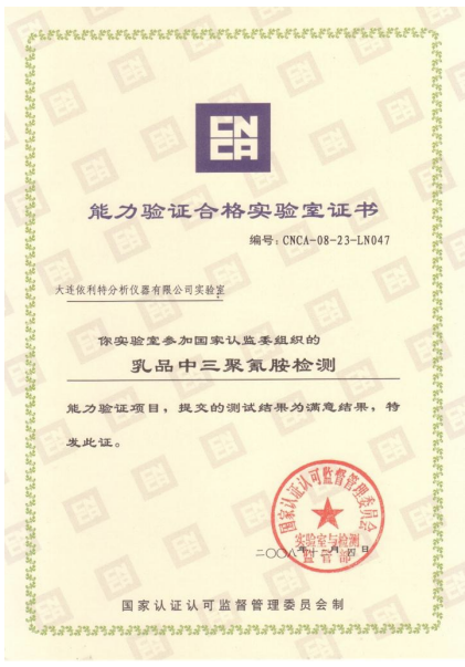 大連依利特分析儀器有限公司作為國內(nèi)知名廠家,秉承著 “質(zhì)量更佳、服務(wù)更優(yōu)、創(chuàng)新更快” 的理念,二十年來為食品安全、藥品檢測及高校應(yīng)用等眾多行業(yè)提供著完善的分析方法及先進(jìn)的儀器配置。從蘇丹紅、孔雀石綠到 “三鹿奶粉三聚氰胺” 事件,關(guān)系著國計民生的 “食品安全” 問題一次次為我們敲響警鐘,并引起社會廣泛關(guān)注。針對 “三聚氰胺” 事件,依利特人在第一時間做出反應(yīng),榮獲由國家認(rèn)證認(rèn)可監(jiān)督管理委員會頒發(fā)的 “能力驗證合格實驗室證書”,并且按照 GB/T 22388-2008《原料乳與乳制品中三聚氰胺檢測方法》、GB/T 22400-2008《原料乳中三聚氰胺快速檢測 液相色譜法》的國家標(biāo)準(zhǔn),在經(jīng)過大量實驗驗證后,提供出符合國標(biāo)的三聚氰胺檢測解決方案,包括分析方法驗證及推薦儀器配置在內(nèi)的全套解決方案。