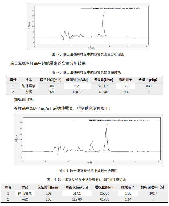 參考標(biāo)準(zhǔn):GB/T 21915-2008《食品中納他霉素的測定 液相色譜法》,分析瑞士蛋糕卷中納他霉素的含量