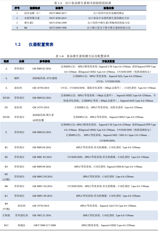 附錄文件:GB 5009 系列、GB 14750 等標準原文節(jié)選、維生素標準溶液校正詳細步驟、耗材訂貨清單(色譜柱、試劑、濾膜型號編碼)。