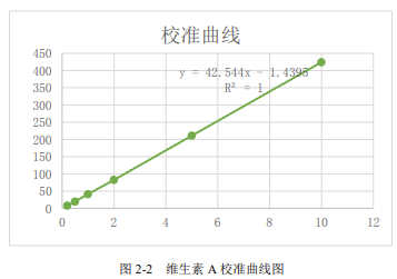 根據(jù)濃度和峰面積數(shù)據(jù),得到維生素 A 的線性曲線方程為:y=42.544x - 1.4395,R^{2}=1.000。因此維生素 A 在 0.2~10μg/mL 濃度范圍內(nèi),線性關系良好。