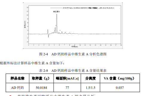 該色譜條件下,儀器的基線噪音為 0.0302mAU,根據(jù)信噪比S/N=3,計算得到維生素 A 的儀器小檢測濃度為 0.017μg/mL,實際方法檢出限為 3.5μg/100g,比國標的方法檢出限 10μg/100g,靈敏度高了不少。實際樣品分析AD 鈣奶樣品中維生素 A 的含量分析