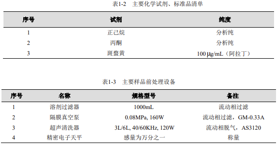 實(shí)驗(yàn)過程中其它玻璃器皿還包括容量瓶 (100mL、50mL、25mL、10mL)、移液槍 (0~1000μL,0~5000μL)、移液槍槍頭 (1mL,5mL)、一次性 PVC 手套、一次性口罩、進(jìn)樣針、濾膜等若干。