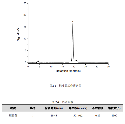 (圖 2-1 標(biāo)準(zhǔn)品工作液譜圖,橫坐標(biāo)為 Retention time (min),范圍 0-35,縱坐標(biāo)為 Signal (mV),范圍 0-25,圖中斑蝥黃對應(yīng)峰的保留時間約為 19.45min)