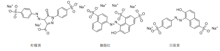 合成著色劑可分為偶氮類和非偶氮類兩種結(jié)構(gòu),在酸堿條件下均穩(wěn)定;按溶解性可分為脂溶性和水溶性,其中脂溶性著色劑因不溶于水、體內(nèi)不易排出、毒性較大,已不允許在食品行業(yè)添加,目前世界各國使用的合成著色劑多為水溶性偶氮類著色劑。