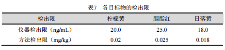 本系統(tǒng)的基線噪聲為25μV,根據(jù)3倍信噪比,儀器的小檢出限分別為檸檬黃20ng/mL,胭脂紅25ng/mL,日落黃18ng/mL。根據(jù)前處理方法計(jì)算,各目標(biāo)物的方法檢出限分別為檸檬黃20μg/kg,胭脂紅25μg/kg,日落黃18μg/kg,參見表7。