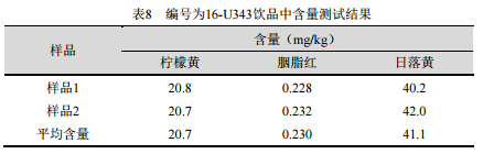 按照上述方法分析中國檢驗(yàn)檢疫科學(xué)研究院測試評(píng)價(jià)中心提供的飲品(樣品編號(hào)16-U343),測試含量結(jié)果見表8。