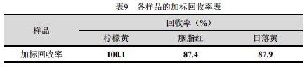 樣品中加入濃度為50μg/mL的混標(biāo)溶液1mL,經(jīng)過處理后分析,得到的各樣品的加標(biāo)回收率見表9。