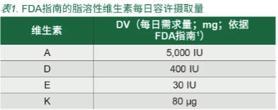 維生素是人體內(nèi)各種代謝功能所必需的微量營養(yǎng)素。維生素可分為水溶性和脂溶性維生素。脂溶性維生素 (FSV) 主要由維生素 A、D、E 和 K 組成,儲存在肝臟和脂肪組織中,消除速率比水溶性維生素慢。因此,人體不需要經(jīng)常補(bǔ)充 FSV。FDA 建議人體 FSV 推薦攝入量 / 耐受量見表 1。