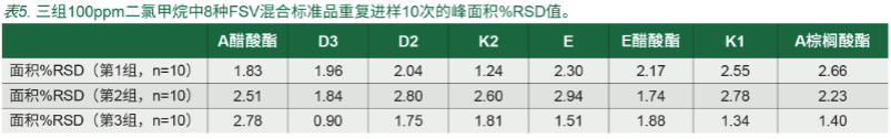 如圖 1 所示,在不到 15 分鐘的時間內(nèi)實(shí)現(xiàn)了 8 種維生素良好色譜分離,如圖 2 所示,5 次重復(fù)檢測的重疊顯示了出色的色譜重現(xiàn)性。三組 10 次重復(fù)進(jìn)樣使用二氯甲烷制備的 100μg/mL FSV 標(biāo)準(zhǔn)品,所有峰面積的 % RSD 均小于 3%(表 5)。這表明進(jìn)樣之間擁有出色的重現(xiàn)性。