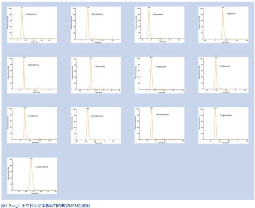 在上述實驗條件下得到的十三種 β- 受體激動劑的典型 MRM 色譜圖見圖 1。十三種 β- 受體激動劑的藥物可以實現(xiàn)色譜分離且峰形良好,經(jīng)過優(yōu)化的梯度可以和基質(zhì)干擾分開。