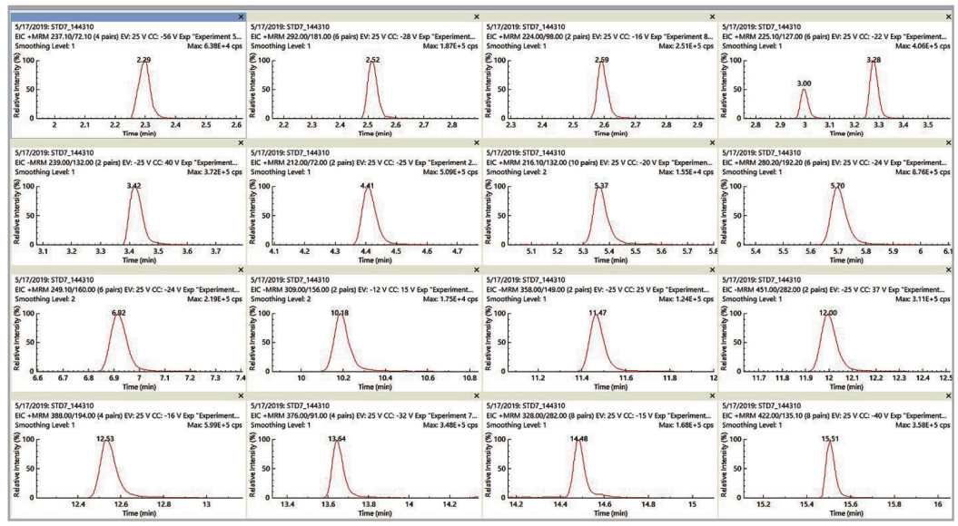 在上述實驗條件下得到數(shù)種農(nóng)藥化合物的 MRM 色譜圖,見圖 1。