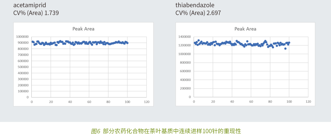 面對農(nóng)產(chǎn)品檢測越來越多樣和復(fù)雜的檢測樣品,三重四極桿質(zhì)譜的穩(wěn)定性和抗污染能力對于儀器的使用和維護(hù)來說也是非常重要的內(nèi)容。以待測樣品中常見而且非常復(fù)雜的茶葉基質(zhì)為例 (見圖 5),基質(zhì)加標(biāo)濃度 20ng/mL 連續(xù)進(jìn)樣 100 針,測試 MS2 Vertical9100 的耐臟性能。圖 6 展示了部分農(nóng)藥在 100 針進(jìn)樣條件下峰面積重現(xiàn)性均小于 5% 的良好數(shù)據(jù)。Elite MS2 Vertical 9100 系列三重四極桿質(zhì)譜具有獨特的 "不怕臟、臟不怕、怕不臟" 的硬件設(shè)計:1. 帶有反吹干燥氣的雙錐孔質(zhì)譜接口結(jié)合離子源主動排放廢氣泵設(shè)計,具有優(yōu)異的抗污染能力,長時間無需維護(hù)離子源;2.HSID 熱表面誘導(dǎo)去溶劑質(zhì)譜接口技術(shù),320° 加熱的質(zhì)譜接口使得儀器有效防止樣品中的復(fù)雜基質(zhì)污染儀器,長時間運行免于頻繁維護(hù);3. 層流氣離子導(dǎo)向技術(shù),提高離子傳輸效率避免頻繁的儀器調(diào)諧。優(yōu)異的耐臟基質(zhì)和污染物的硬件設(shè)計,保證滿足檢測靈敏度要求的同時,大程度使得儀器免于頻繁停機(jī)清洗和維護(hù),大大提高了儀器的利用效率。