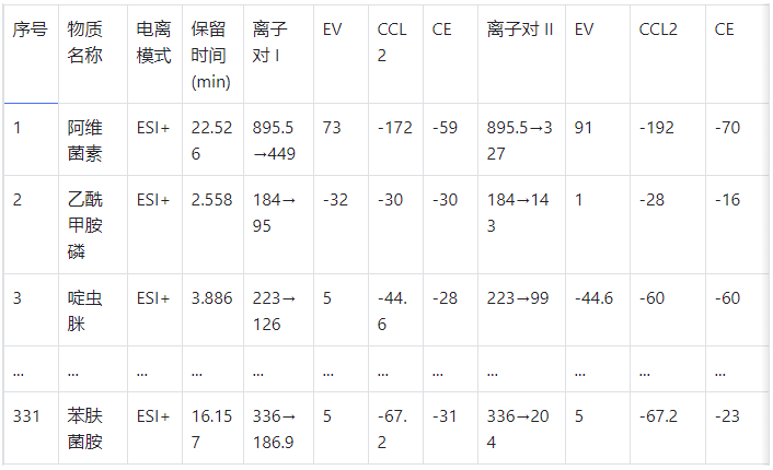 表 3 375 種農殘類化合物質譜參數列表(部分示例如下,完整表格見 PDF):