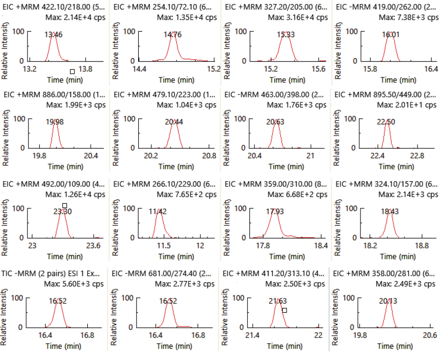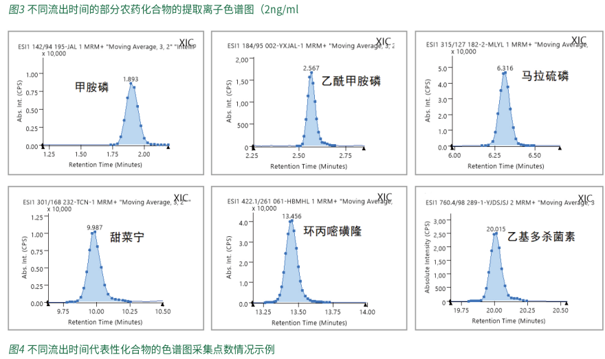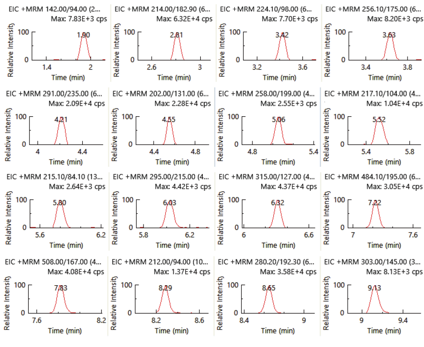 本方法采用一針進樣,通過Time Managed MRM正負切換模式同時測定331種化合物及其45種代謝物,共375個化合物,其中365種化合物采用正離子模式采集,10種化合物采用負離子模式采集。圖1中展示了375種化合物的提取離子疊加譜圖,圖2中是單獨10個負離子化合物的提取離子色譜圖。經過優(yōu)化色譜洗脫條件,圖3展示了不同保留時間的部分農藥化合物的提取離子色譜圖。各個化合物峰型對稱,軟件中TimedMRM功能目動完成375個化合物的軒留時間分配,保讓每個色語峰上有足夠的來集點教,以使獲得準確的結果為優(yōu)異的重復性,不同流出時間的代表性化合物的色譜圖采集點數情況示例詳見圖4。