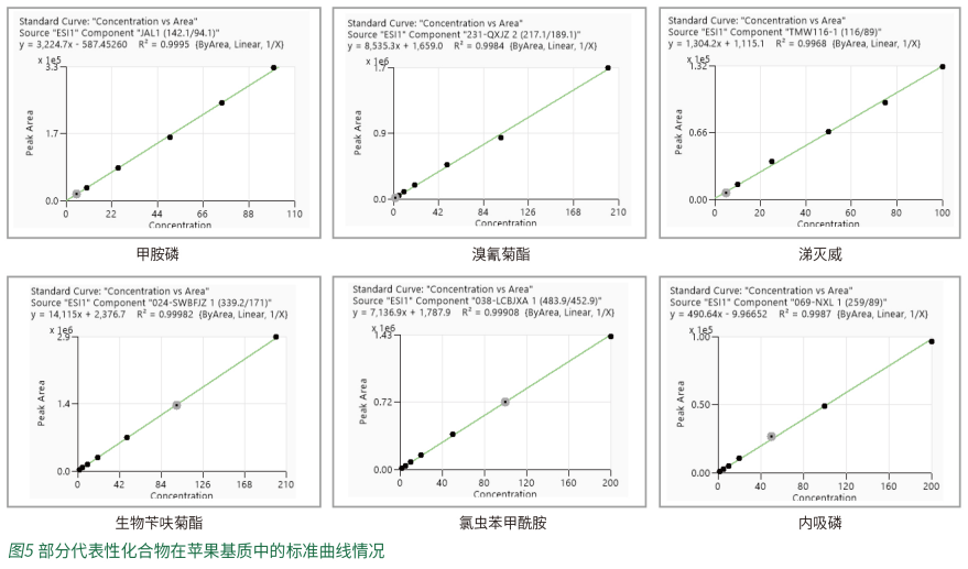 用以上3.1前處理步驟,處理陰性蘋果樣品作為空白基質,稀釋375種化合物的混合標準溶液,制成2ng/mL-200ng/mL的系列校準標準溶液,并繪制標準曲線,采用外標法進行定量分析。圖5為隨機挑選的不同流出時間的化合物的標準曲線情況。其中全部化合物在線性范圍內,線性關系均較好,相關系數R2均大于0.995。