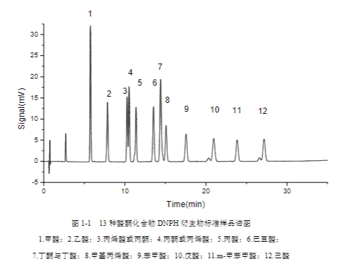 依利特儀器參考以上標(biāo)準(zhǔn),對(duì)汽車尾氣中 13 種醛酮化合物 (詳見(jiàn)表 1-2) 進(jìn)行了檢測(cè),根據(jù)實(shí)驗(yàn)驗(yàn)證結(jié)果,提出了非甲烷有機(jī)氣體 (NMOG) 的檢測(cè)解決方案,供相關(guān)人員參考。