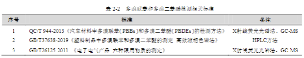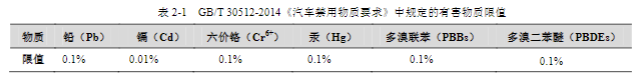 隨著經(jīng)濟(jì)的發(fā)展,人們對(duì)汽車的安全性、舒適性要求逐漸提高,對(duì)汽車生產(chǎn)中使用的有毒有害物質(zhì)限量要求也越來(lái)越嚴(yán)格。多溴聯(lián)苯和多溴二苯醚作為常用的阻燃劑,在汽車車體和內(nèi)飾中廣泛存在。GB/T 30512-2014 《汽車禁用物質(zhì)要求》對(duì)汽車零部件的禁用有害物質(zhì)的含量限值進(jìn)行了要求,詳見(jiàn)下表: