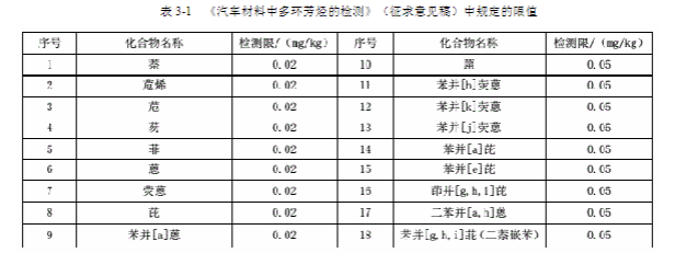 汽車內(nèi)有多種物質(zhì)可能向車內(nèi)釋放多環(huán)芳烴,如汽車的配件 (坐墊、座椅套)、車內(nèi)飾 (門內(nèi)護(hù)板) 以及生產(chǎn)車時(shí)使用的油漆、稀釋劑、粘合用的膠水,甚至一些劣質(zhì)的香水、空氣凈化劑等,都可能含有多環(huán)芳烴。全國(guó)汽車標(biāo)準(zhǔn)委員會(huì) 2019 年 5 月 13 日公布了《汽車材料中多環(huán)芳烴的檢測(cè)》(征求意見(jiàn)稿),該標(biāo)準(zhǔn)是新制定的行業(yè)標(biāo)準(zhǔn),將作為 GB30512《汽車禁用物質(zhì)要求》的修訂版配合標(biāo)準(zhǔn)實(shí)施,預(yù)計(jì) 2020 年開(kāi)始執(zhí)行。