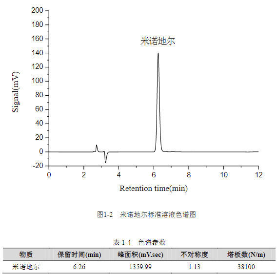 進(jìn)樣分析濃度為 20.0mg/L 米諾地爾標(biāo)準(zhǔn)工作液,使用 1.3.3 中的色譜條件,結(jié)果如下圖所示: