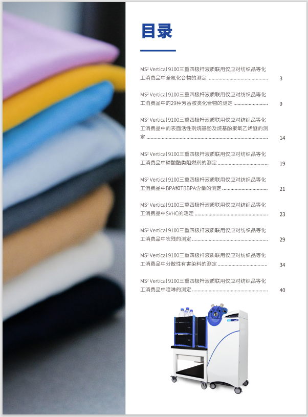 文集覆蓋紡織品等化工消費品中 9 大類高關注度物質的檢測,適配不同基質與法規(guī)要求,具體包括:
