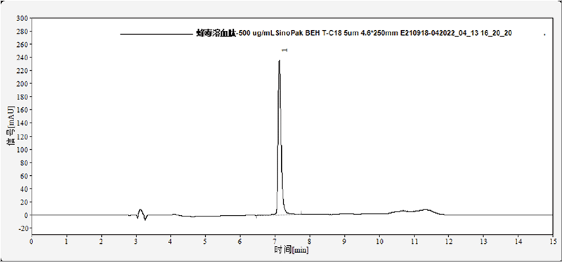 蜂毒溶血肽是一種由26個氨基酸組成的多肽,呈堿性,易溶于水,是一種人類所知的抗炎性強的物質(zhì)之一。依利特參考GB/T 40486-2021,采用新推出SinoPak BEH T-C18 5 μm色譜柱對蜂毒干粉中蜂毒溶血肽進行分析檢測,所得數(shù)據(jù)可供客戶參考使用。